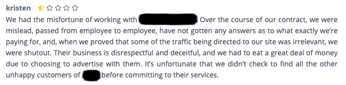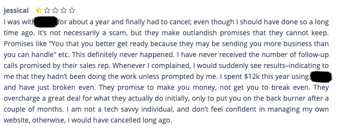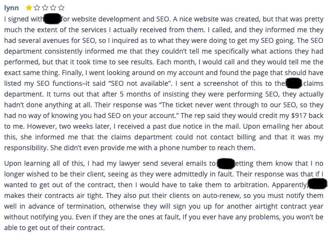 NOTE: it's not our job to point the finger, nor do we want this guide to become a smear campaign. It's not how we operate and it doesn't align with our company values. Therefore we have blacked out the identities of the companies responsible for these outcomes. (by the end of this guide you will know how to spot a scam and stay well away from these kind of companies.)
